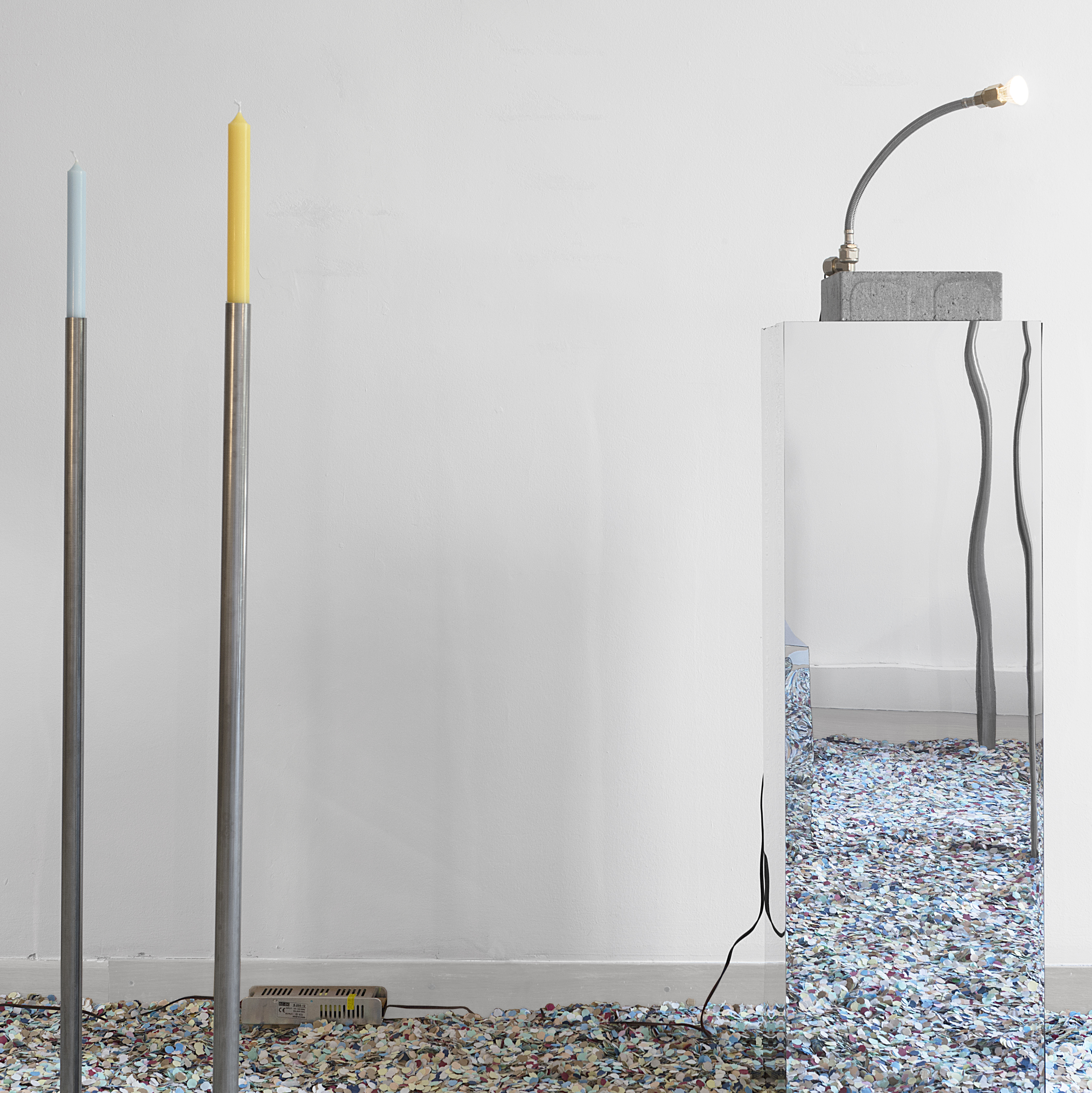 The podiums are mirrowed in order to generate reflections, dissapear and to generate a distorted and variable space, where the public see themselves as part of the exhibition. These podiums will be discovered as the people walk through the room, stepping on to the confetti flooring.
